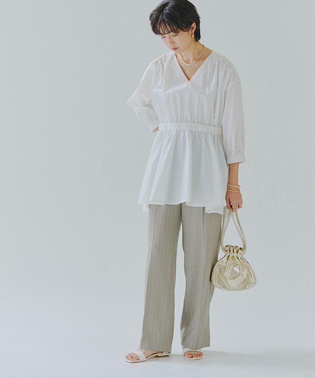 さらっとした表面感が特徴の綿混素材。肌触りも良く、着心地の良い素材感です。柔らかさと程よいハリ感を兼ね備え、綺麗なシルエットをキープします。