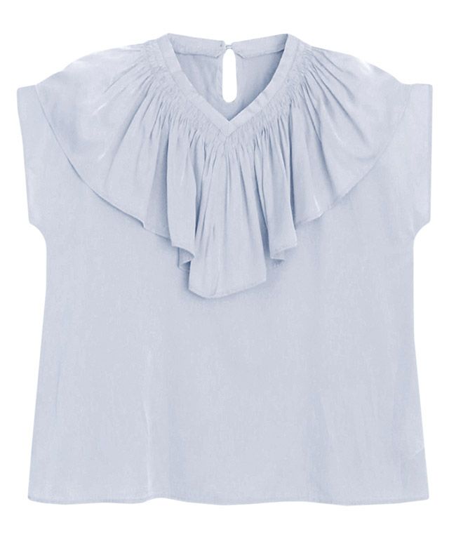 顔周りを華やかな印象に導いてくれるフリルカラーデザイン。フリルには繊細なシャーリングを施し、こだわりの詰まった一枚です。程良く開いたVネックラインがフェミニンなデザインの中にもすっきりとした印象をプラスしてくれます。