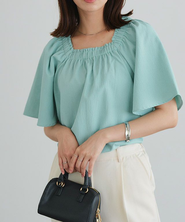 ラグランスリーブで丸みのあるデザインに仕上げた女性らしいアイテム。ネックラインはデコルテ周りがきれいに見えるスクエアネックとVネックで着用できる2way仕様に。袖はボリューム感を最大限まで活かせるラッフルフレアシルエットが大人フェミニンスタイルをつくります。
