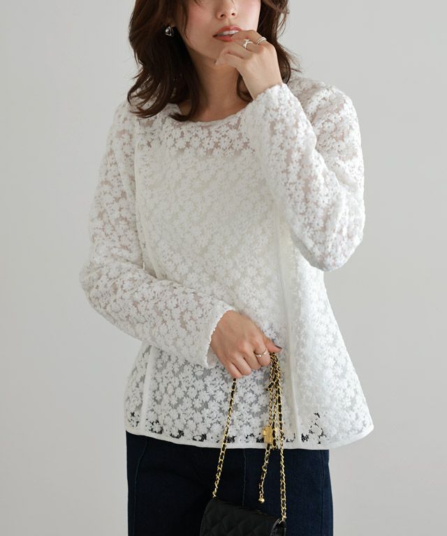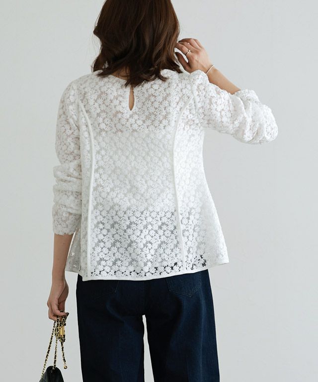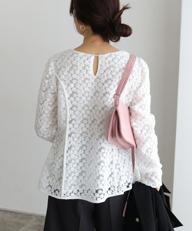 華やかで着映える一枚“総レースパフスリーブペプラムブラウス”