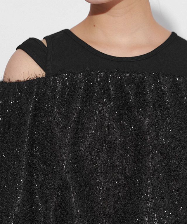 インナーのタンクトップは着心地の良い目の詰まったリブ素材で、オフショルはトレンドライクなラメ入りジャガード素材を使用。オフショルのブラウスは袖を通す部分があるため着用時に着崩れしにくいこともポイントです。