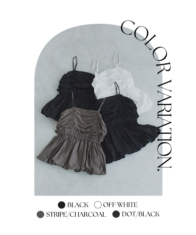 ビスチェ部分とウエストにギャザーをたっぷりと施し華やかな一枚に。裾のバルーンデザインとウエスト切替のフリルデザインが大人レディ感を引き立てます。後ろはシャーリング仕様で窮屈感なく着用可能。肩紐のアジャスターで調節可能なのも嬉しいポイント。