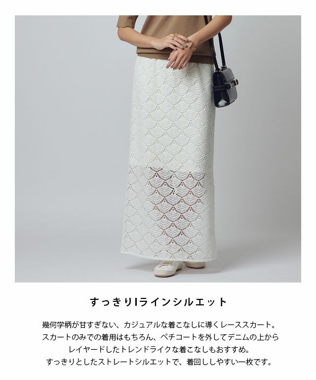 幾何学柄が甘すぎない、カジュアルな着こなしに導くレーススカート。スカートのみでの着用はもちろん、ペチコートを外してデニムの上からレイヤードしたトレンドライクな着こなしもおすすめ。すっきりとしたストレートシルエットで、着回ししやすい一枚です。