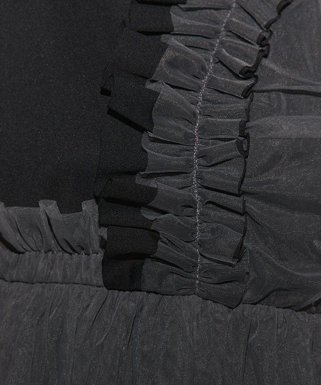 チュールとフリルのデザインを贅沢に使用した着映えトップス。後ろもチュールがレイヤードされたデザインになっており360度どこから見ても可愛い一枚です。ペプラムシルエットで体型カバーしてくれるのも嬉しいポイントです。