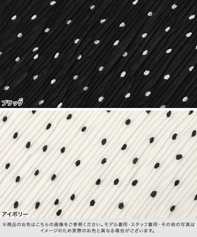 体型カバーしつつフェミニンな装いに“ドット楊柳ウエストタックブラウス”