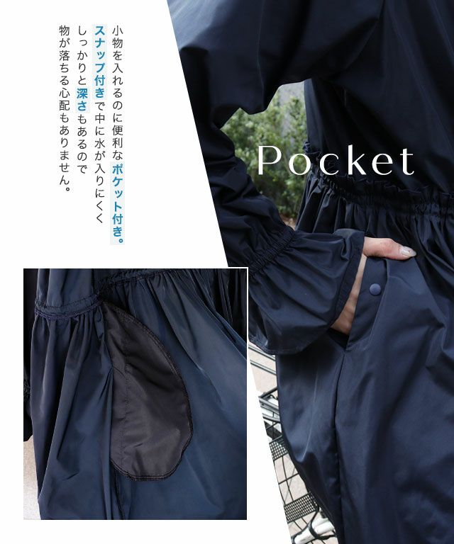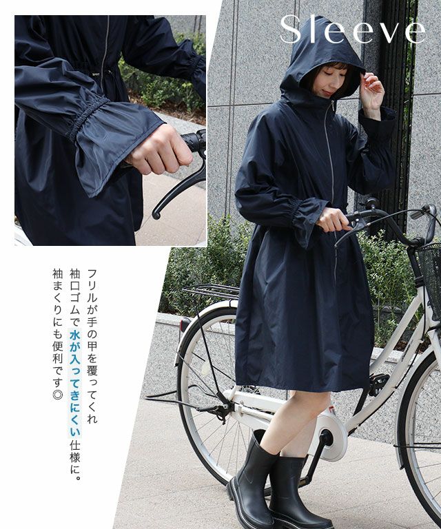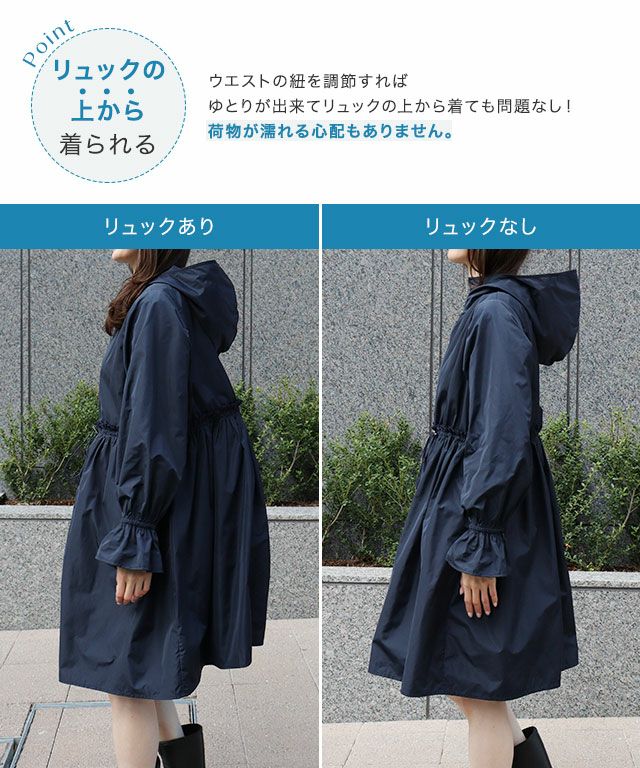 フードや袖口、ポケットなどは雨の日に嬉しい仕様に。ウエストのドロストは絞ることができ、女性らしい印象に仕上がります。レインコートとしてはもちろん、普段着のアウターとしても着られるデザインに仕上げました。