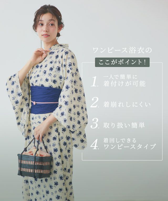 ワンピース型で洋服感覚で簡単に着られる新感覚な一枚。浴衣としてはもちろん、ワンピース単体で着られるところが魅力。浴衣としての着用とまた違った印象で普段着としても着回せます。