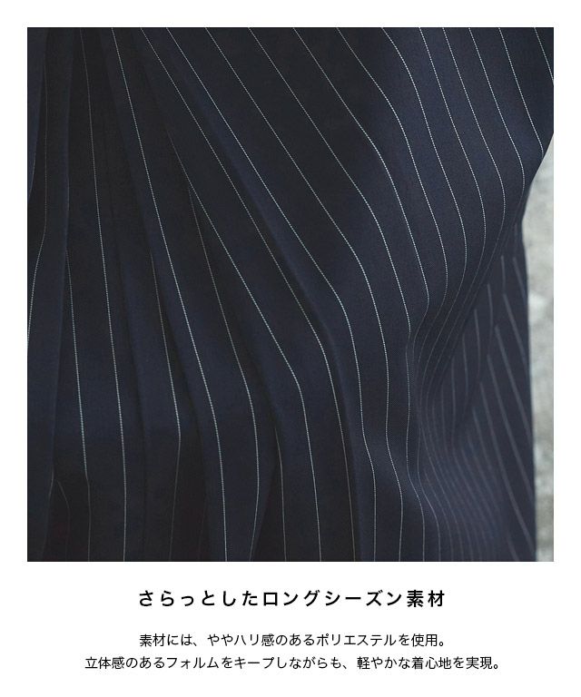 ミニマルなフロントデザインに、バックはインバーテッドプリーツを施し、動くたびふわりと揺れ、後ろ姿に印象的な一枚です。ストライプ柄が縦のラインを強調し、すっきりとした印象に導きます。