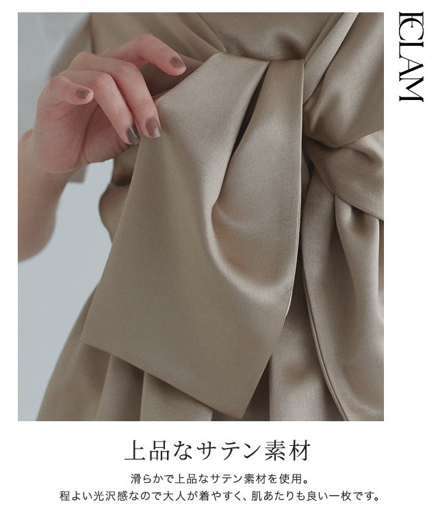 滑らかで上品なサテン素材を使用。程よい光沢感なので大人が着やすく、肌あたりも良い一枚です。