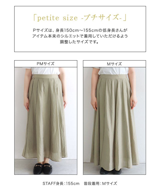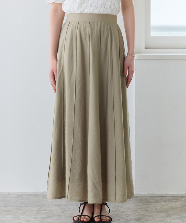 全面に施したパネル切替デザインがプリーツ見えを実現。裾に向かって広がるフレアラインが立体的なシルエットに仕上がり、上品な印象を引き立てます。後ろウエストはゴム仕様なので楽な着心地を叶えます。