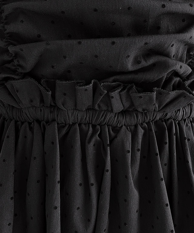 ビスチェ部分とウエストにギャザーをたっぷりと施し華やかな一枚に。裾のバルーンデザインとウエスト切替のフリルデザインが大人レディ感を引き立てます。後ろはシャーリング仕様で窮屈感なく着用可能。肩紐のアジャスターで調節可能なのも嬉しいポイント。