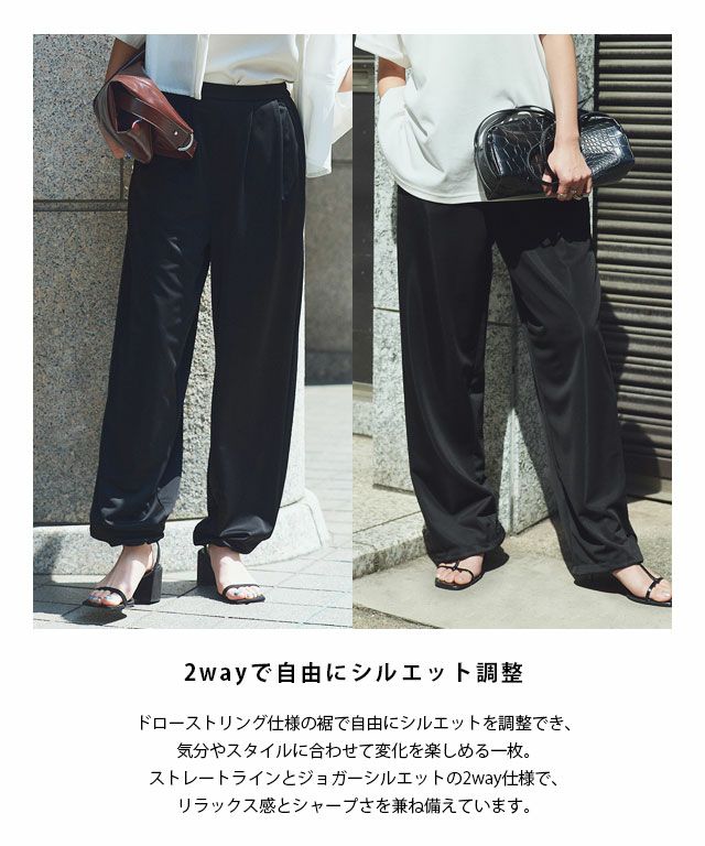 ドローストリング仕様の裾で自由にシルエットを調整でき、気分やスタイルに合わせて変化を楽しめる一枚。ストレートラインとジョガーシルエットの2way仕様で、リラックス感とシャープさを兼ね備えています。後ろウエストはバックゴム仕様で、どんな時でも快適な着心地をキープします。
