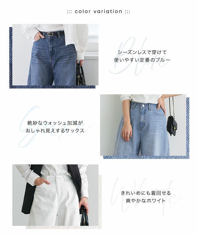 レーヨン混にすることでデニム特有の固さを軽減。綿のハリ感がシルエットをキープしつつも、程良く柔らかな肌触りの生地感です。ホワイトは伸縮性がありブルーやサックスに比べると柔らかな風合いです。