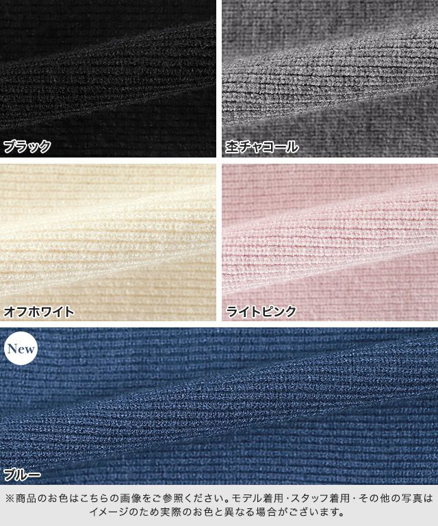 また、ニット製品は生産の過程上「生地を織る際の糸の継ぎ目」繊維の「混紡」、プレス加工、製品洗い加工によって形やサイズ(5cm前後)に誤差が生じる場合がございますが品質上の問題はございません。