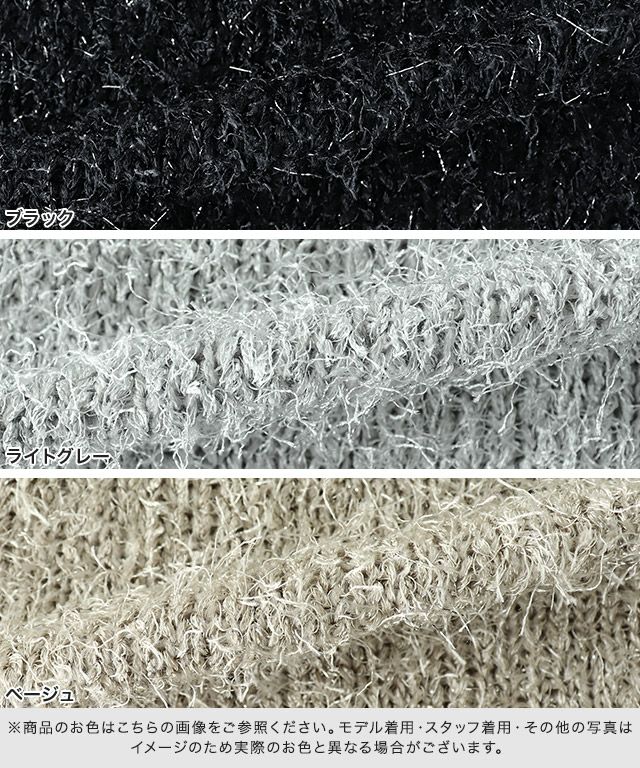 毛足の長いシャギー素材とラメ糸をMIXさせたニットが存在感のある一枚。ふわふわの肌触りで、裏地も付いているので安心して着用していただけます。