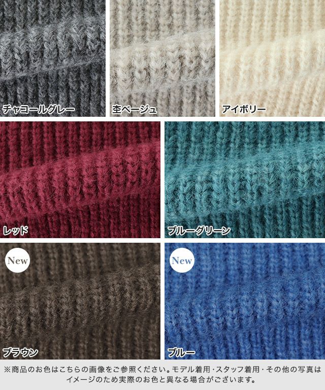 また、ニット製品は生産の過程上「生地を織る際の糸の継ぎ目」繊維の「混紡」、プレス加工、製品洗い加工によって形やサイズ(5cm前後)に誤差が生じる場合がございますが品質上の問題はございません。