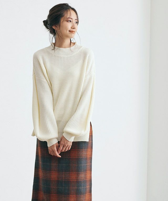 ボリューム袖が女性らしい印象でシンプルながらもアクセントになり、ハイネックが上品見えを叶えます。ボトムを選ばず合わせやすいアイテムです。