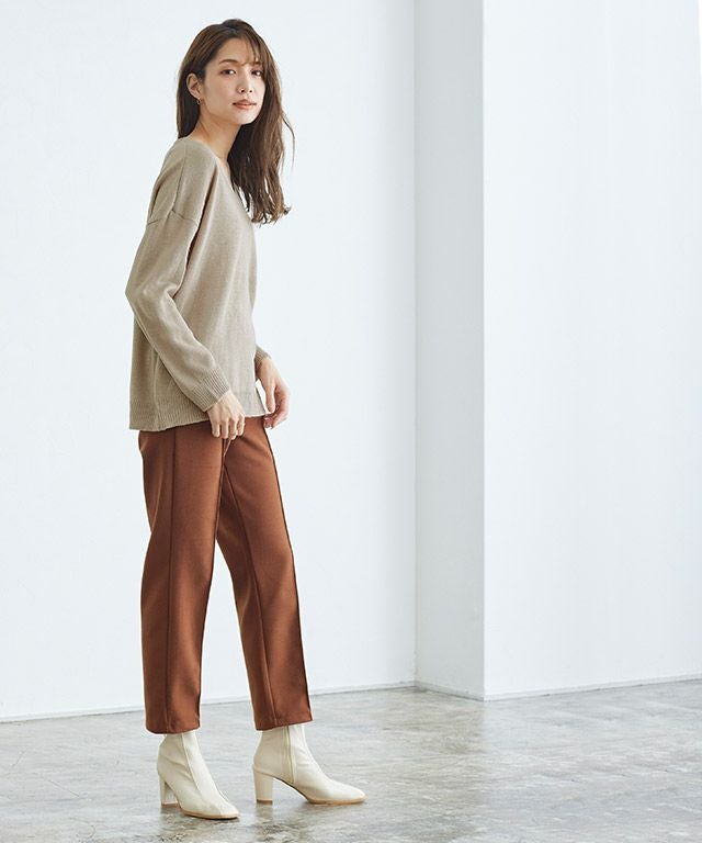 柔らかな風合いでチクチク感のないニット素材を使用。シンプルな天竺編みにすることで、コーディネートに合わせやすく、ご自宅でお洗濯していただけるのでお手入れも簡単です。