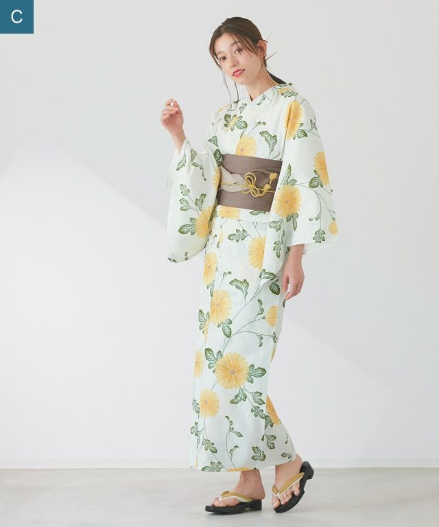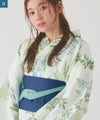 全体的に淡いニュアンスカラーがトレンドライクで女性らしい印象の麻混浴衣。仕立て上がりなのでお届け後すぐに着用できます。程良いハリとしなやかさがあり結びやすい半巾帯のセット。表裏で異なるカラーなので、いろんな表情を見せてくれます。帯も全体的に優しめのカラーや浴衣の柄の色味に合わせたものがセットになっているので、派手すぎず落ち着いた印象に仕上がります。