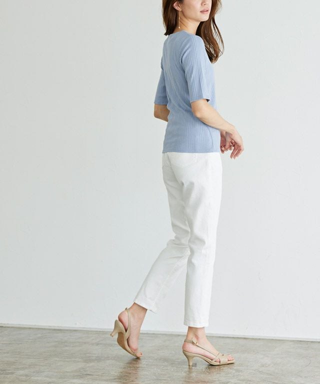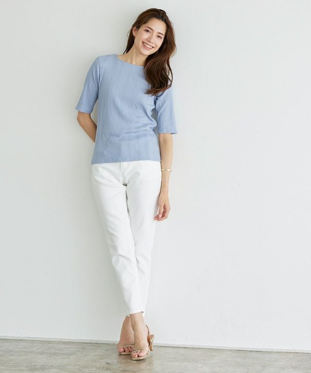 また、ニット製品は生産の過程上「生地を織る際の糸の継ぎ目」繊維の「混紡」、プレス加工、製品洗い加工によって形やサイズ(5cm前後)に誤差が生じる場合がございますが品質上の問題はございません。
