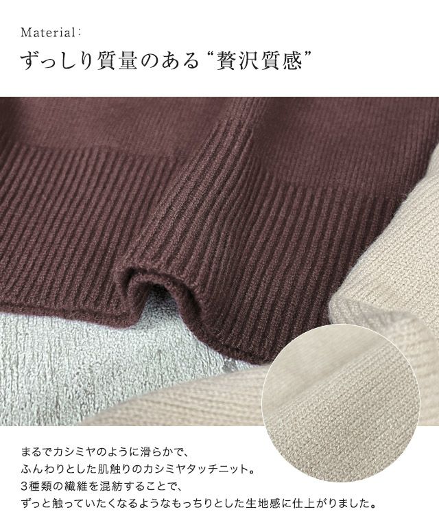 まるでカシミヤのように滑らかでふんわりとした肌触りのカシミヤタッチニット。3種類の繊維を混紡することにより、もっちりとした風合いで一度着たら誰もがやみつきに◎ずっしりと質量のある、贅沢な厚みが魅力です。