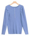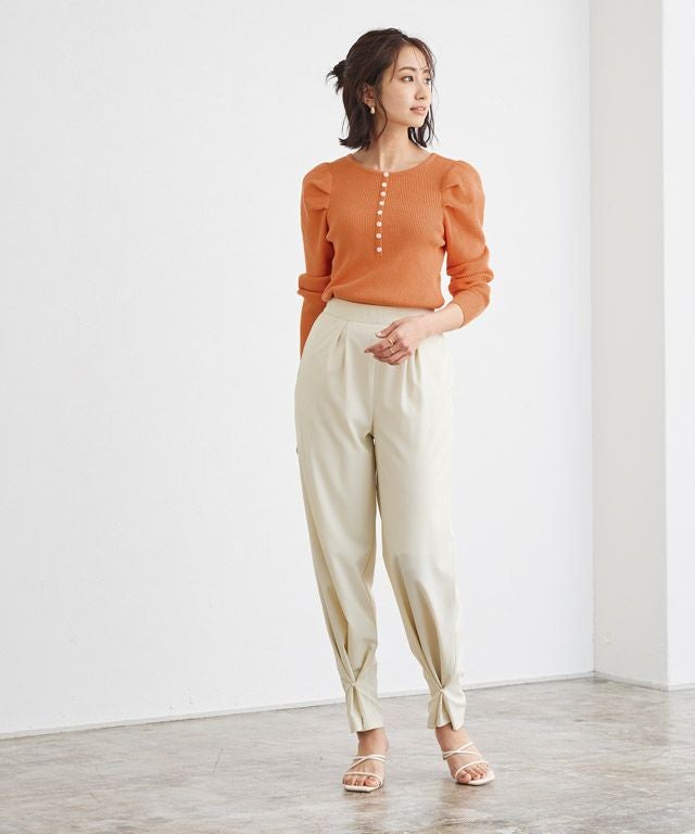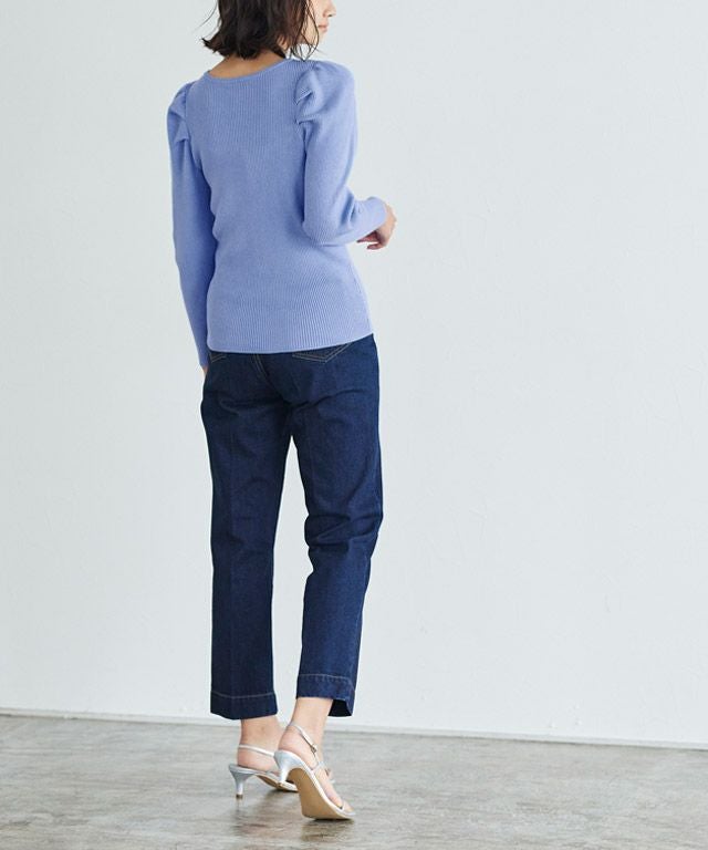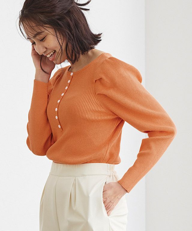 肩に施されたタックでボリューム感を出し、コーデにアクセントをプラス。首元のボタンでこなれ感のある雰囲気に導きます。こだわりのディテールが詰まった一枚で着映えるデザインニットです。