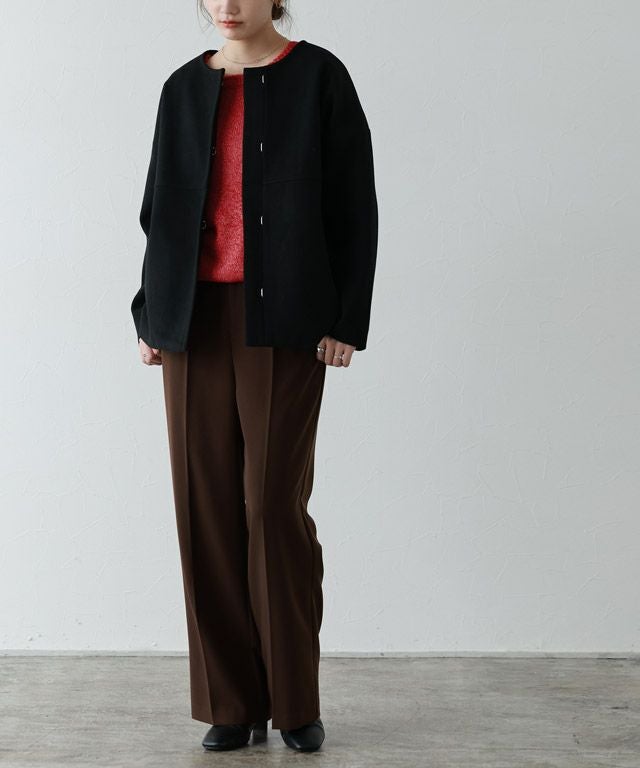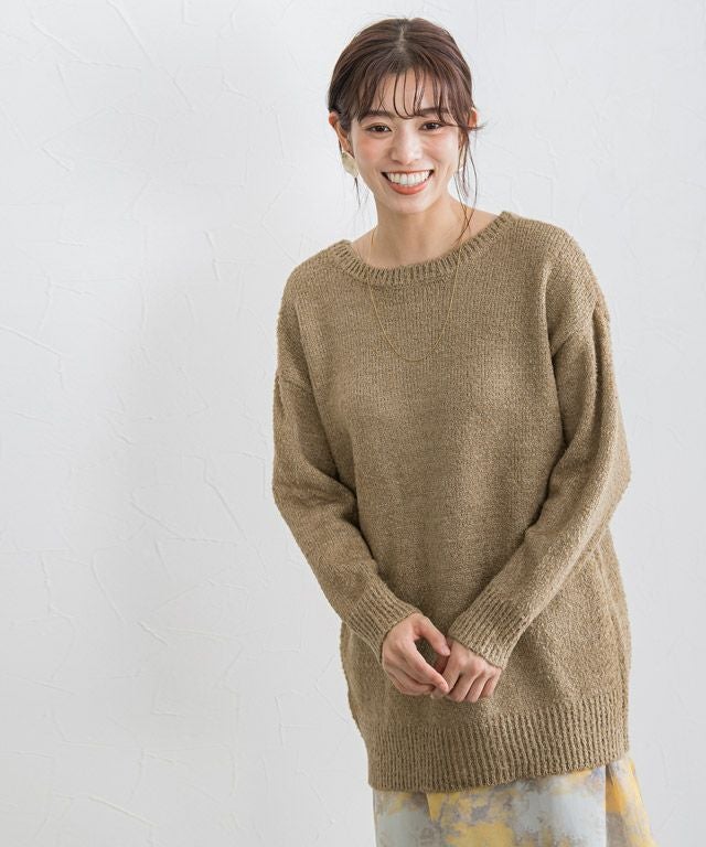 C着丈はお尻がすっぽり隠れる丈感でした。袖丈は手首ちょうどです。身幅は程よいゆとりがありました。前後2wayで着用できるので着回せる一枚です。柔らかいブークレ生地でした。