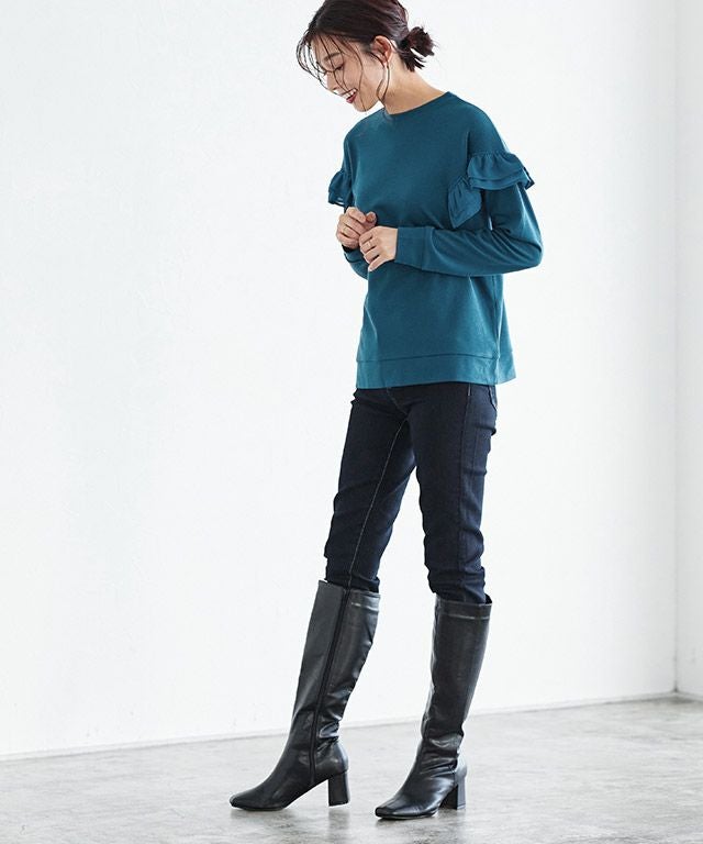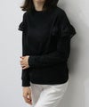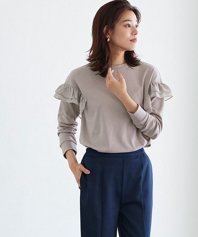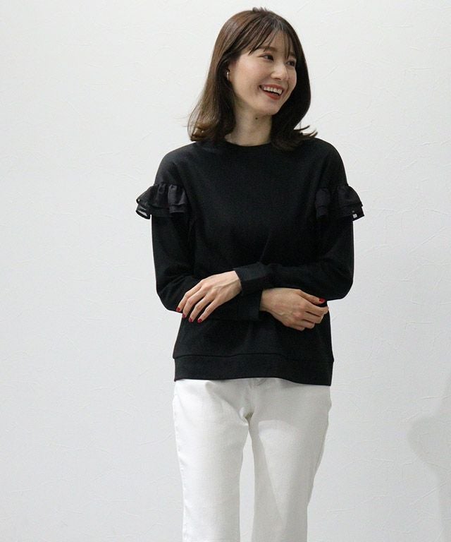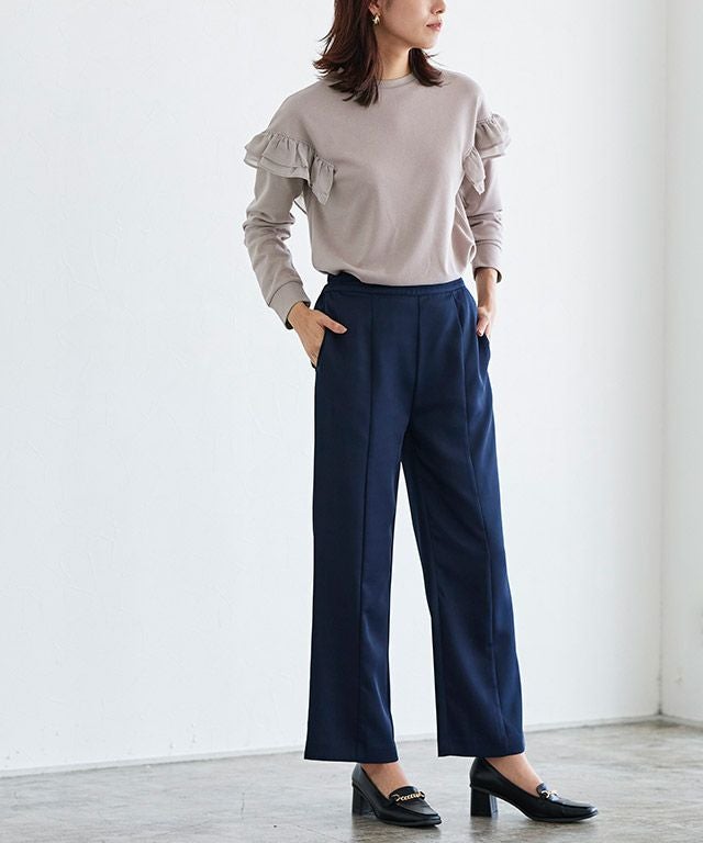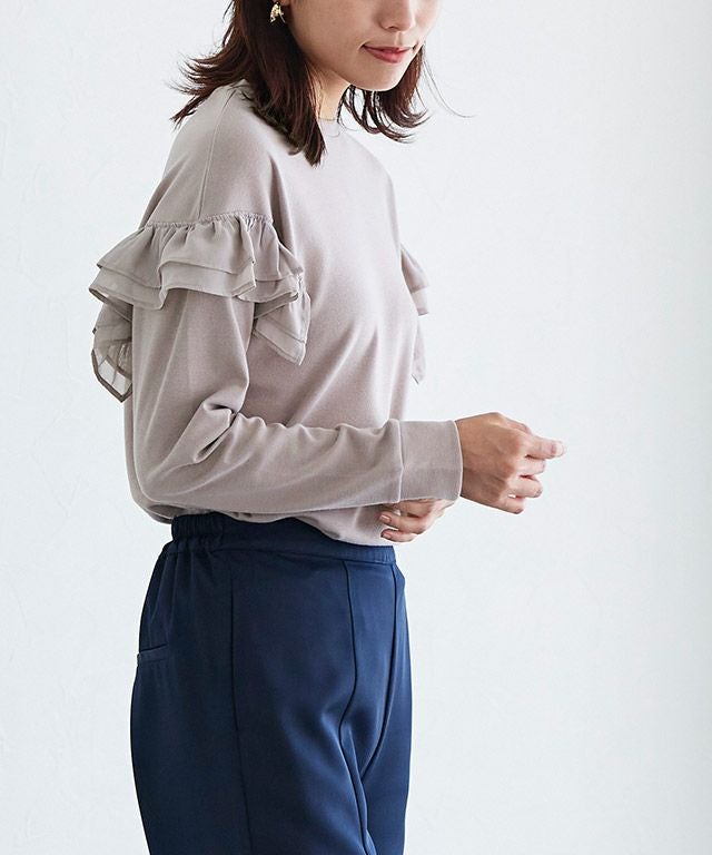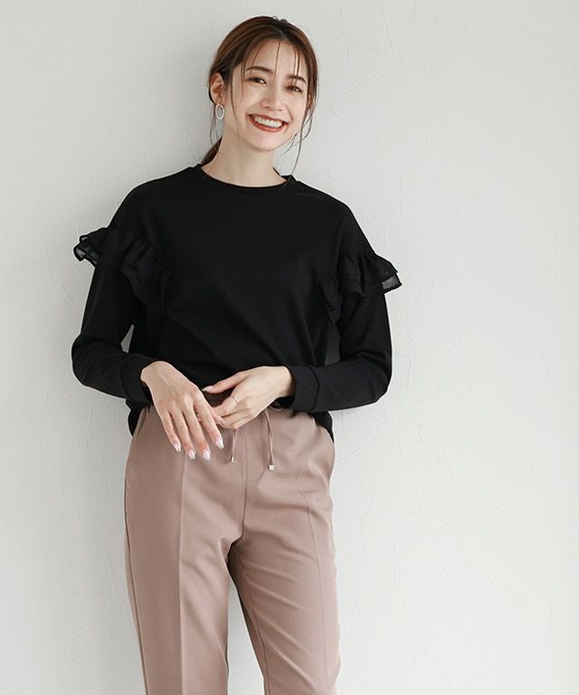 程良くハリのある柔らかなポンチ素材は着心地抜群。滑らかな表面感がきれいめな印象に導きます。フリル部分はシフォン素材で、きれいな女性らしいシルエットを演出します。
