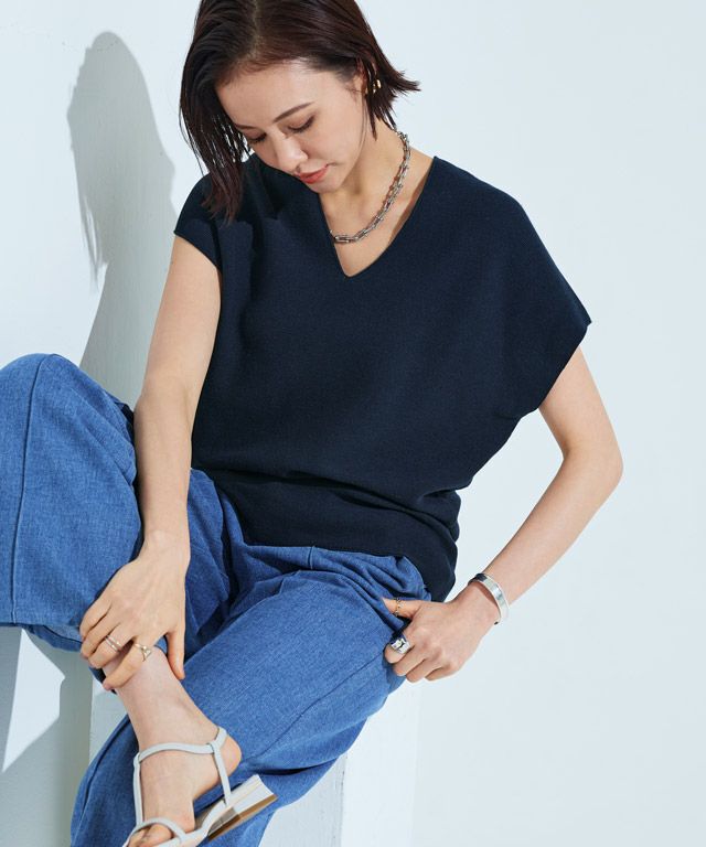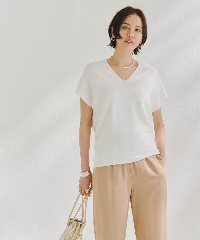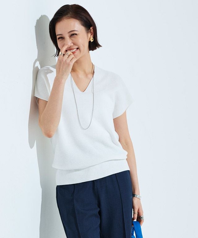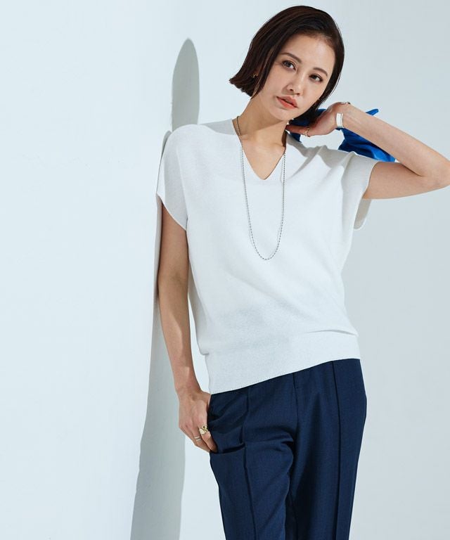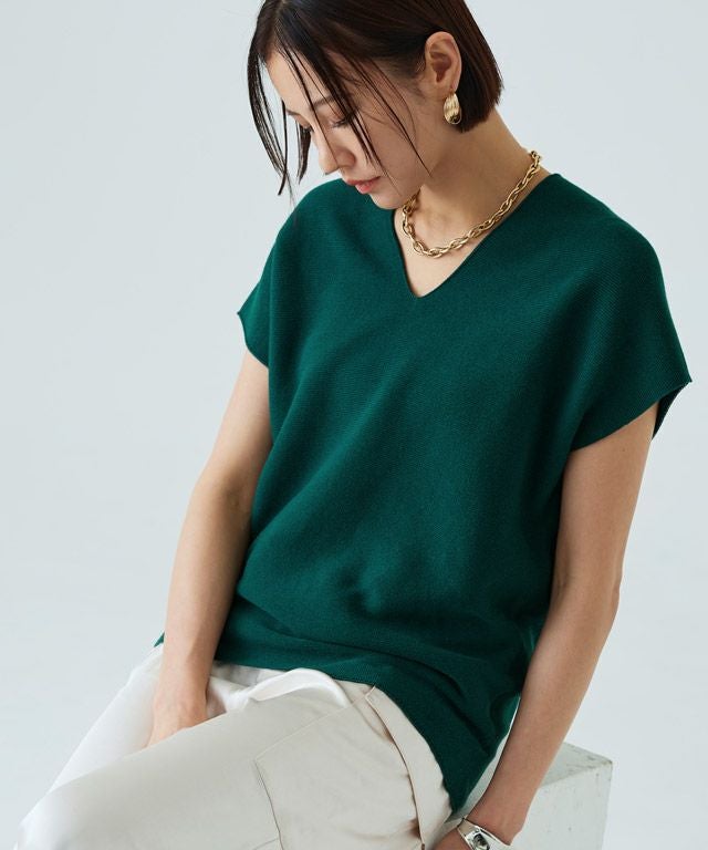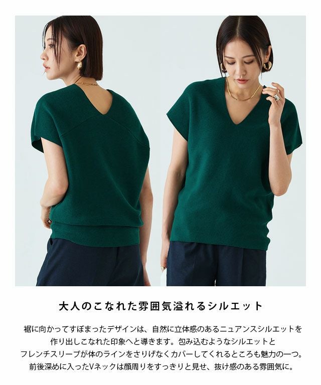 裾に向かってすぼまったデザインは、自然に立体感のあるニュアンスシルエットを作り出し、こなれた印象へと導きます。包み込むようなシルエットとフレンチスリーブが体のラインをさりげなくカバーしてくれるところも魅力の一つです。前後深めに入ったVネックは顔周りをすっきりと見せ、抜け感のある雰囲気に。