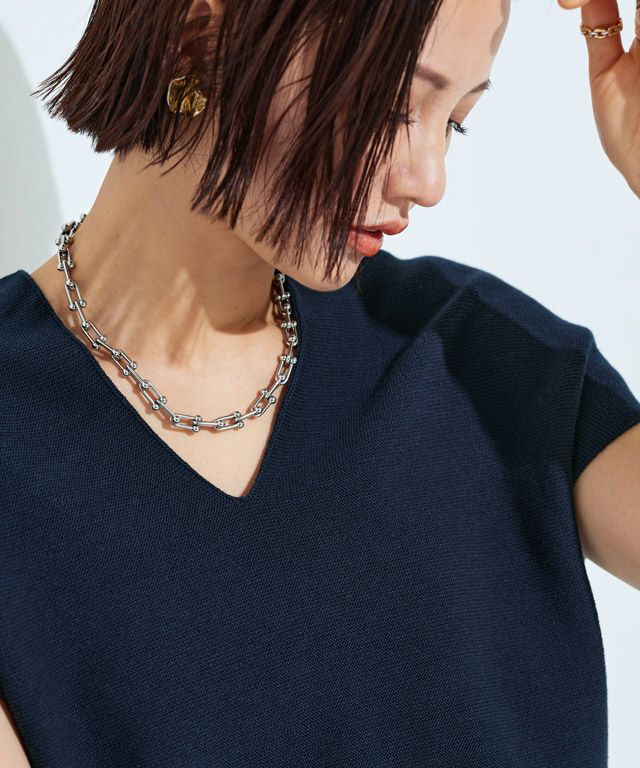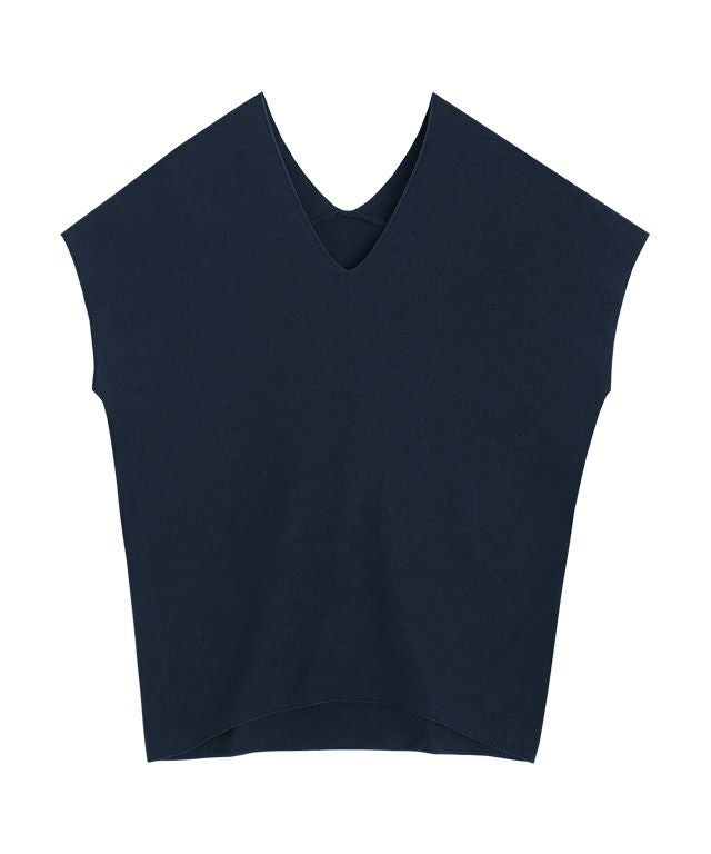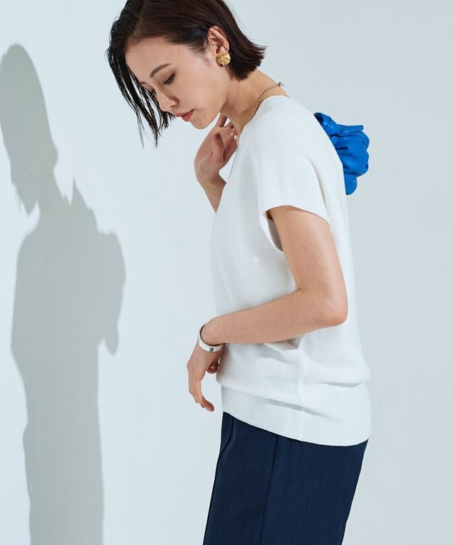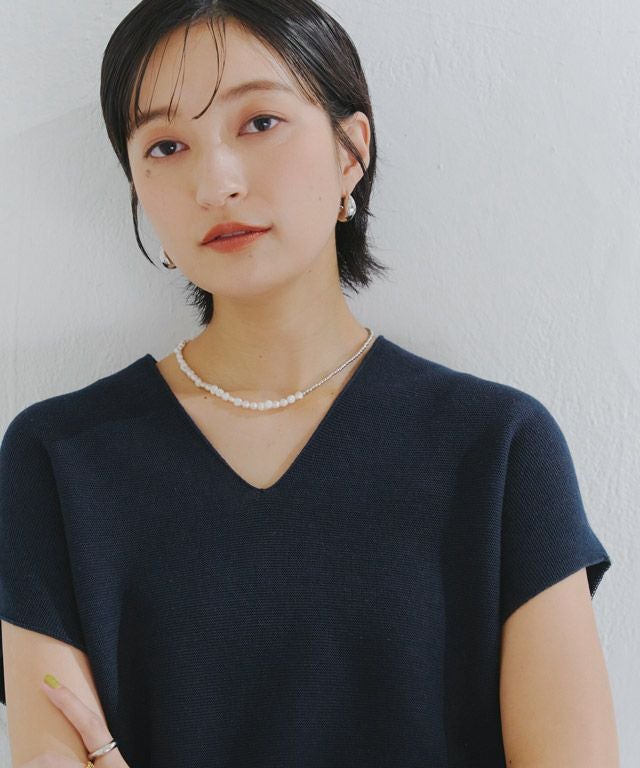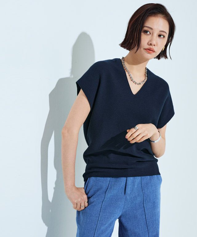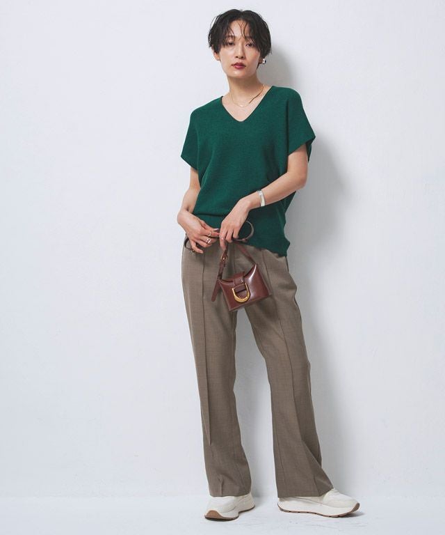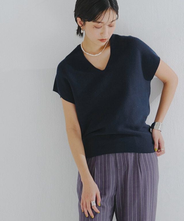裾に向かってすぼまったデザインは、自然に立体感のあるニュアンスシルエットを作り出し、こなれた印象へと導きます。包み込むようなシルエットとフレンチスリーブが体のラインをさりげなくカバーしてくれるところも魅力の一つです。前後深めに入ったVネックは顔周りをすっきりと見せ、抜け感のある雰囲気に。