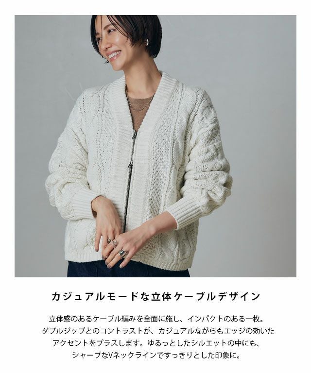立体感のあるケーブル編みを全面に施し、インパクトのある一枚。ダブルジップとのコントラストが、カジュアルながらもエッジの効いたアクセントをプラスします。ゆるっとしたシルエットの中にも、シャープなVネックラインですっきりとした印象に。