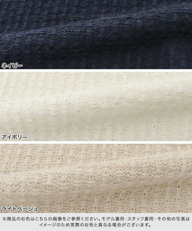 また、ニット製品は生産の過程上「生地を織る際の糸の継ぎ目」繊維の「混紡」、プレス加工、製品洗い加工によって形やサイズ(5cm前後)に誤差が生じる場合がございますが品質上の問題はございません。