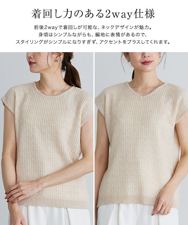 前後2wayで着回しが可能な、ネックデザインが魅力。身頃はシンプルながらも、編地に表情があるので、スタイリングがシンプルになりすぎず、アクセントをプラスしてくれます。ボトムスを変えるだけでシチュエーションレスにご着用いただけるのも嬉しいポイント。
