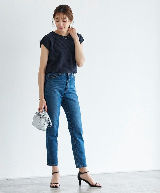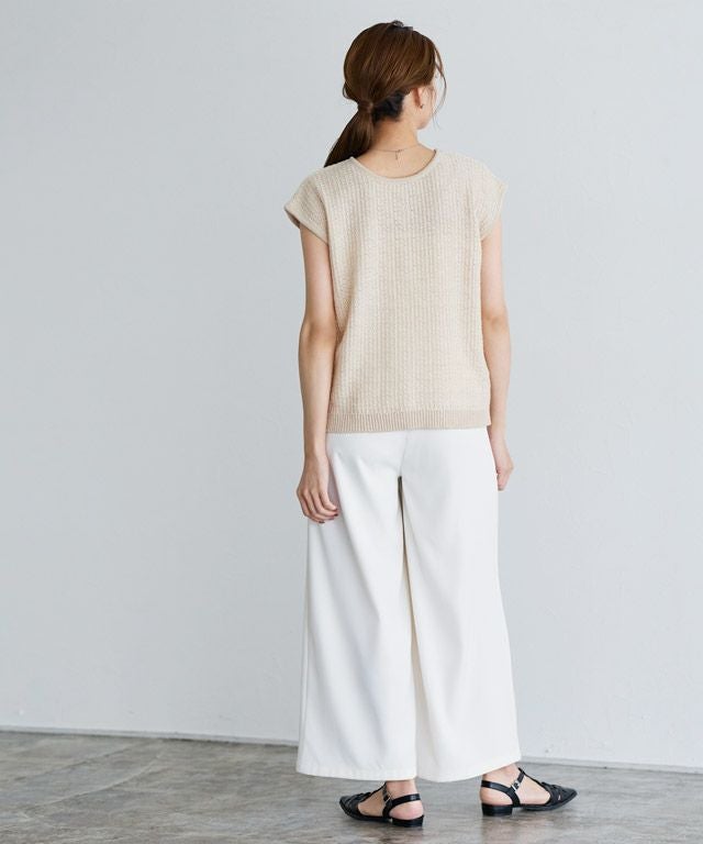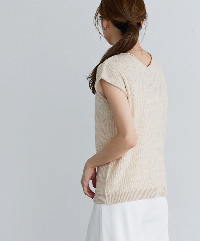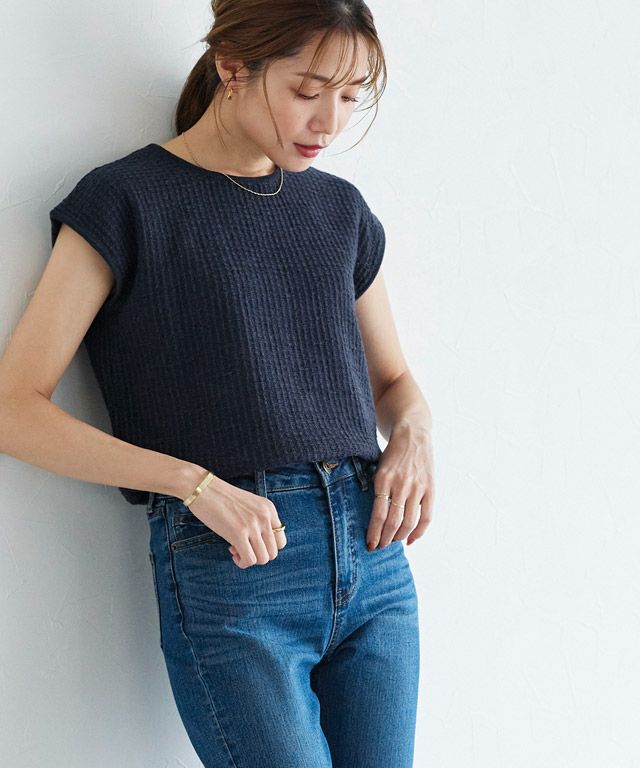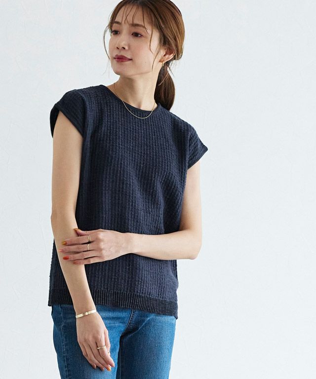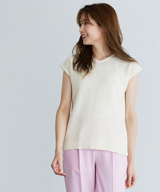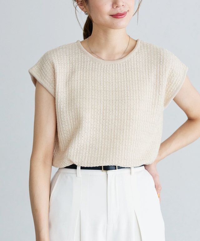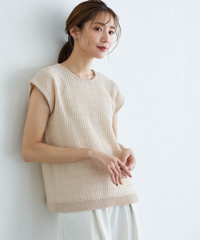 スラブ糸を一緒に編み上げることで、清涼感のある夏らしいニット素材。肌離れも良く暑い夏にもオススメです。