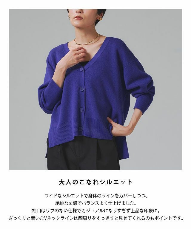 ワイドなシルエットで身体のラインをカバーしつつ、絶妙な丈感でバランスよく仕上げました。袖口はリブのない仕様でカジュアルになりすぎず上品な印象に。ざっくりと開いたVネックラインは顔周りをすっきりと見せてくれるのもポイントです。