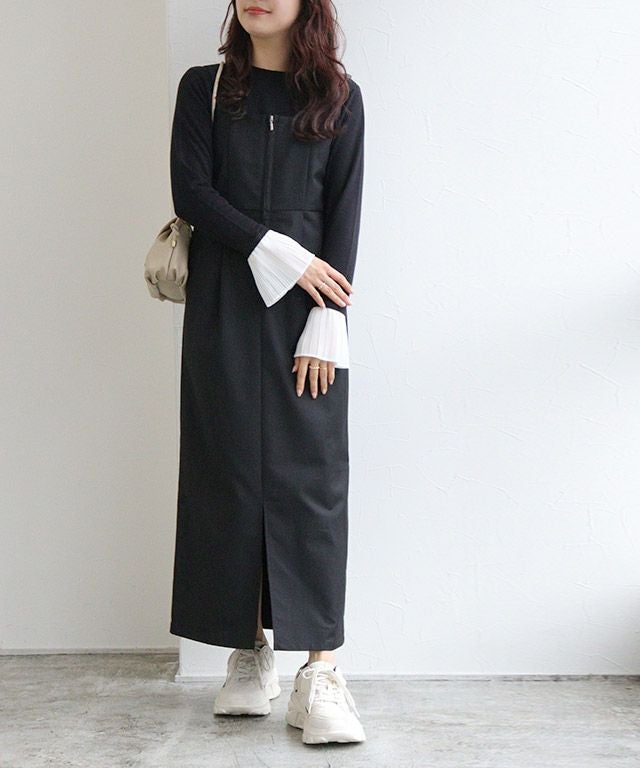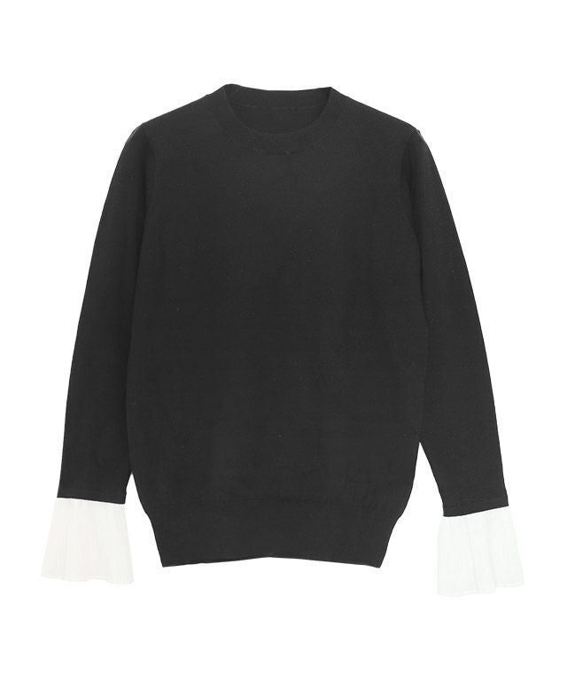 袖口に程良く透け感のある布帛生地をドッキングしたデザインニット。着るだけで着映え感のあるスタイリングが叶います。一枚での着用はもちろん、ジレやジャンパースカートのインナーとしても活躍◎ボトムスを選ばず着回しやすいデザインです。