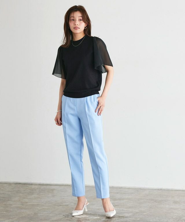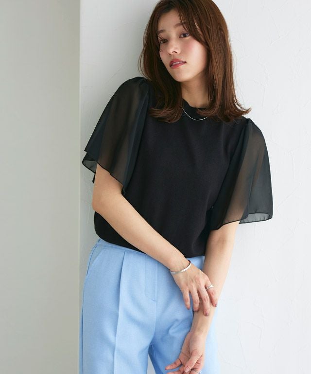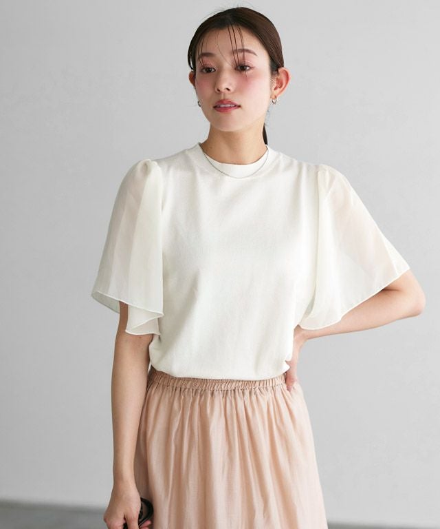 袖部分にシフォン素材をドッキングさせ、一枚でこなれ感が漂うデザインに仕上げました。身頃はシンプルな天竺編みにすることで、ロングシーズン着用できるのも嬉しいポイント。ふんわりとしたフレアスリーブで二の腕周りをカバーできるのも魅力です。