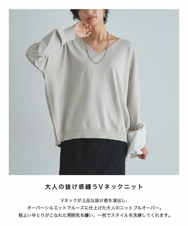 Vネックが上品な抜け感を演出し、オーバーシルエットでルーズに仕上げた大人のニットプルオーバー。程よいゆとりがこなれた雰囲気を纏い、一枚でスタイルを洗練してくれます。