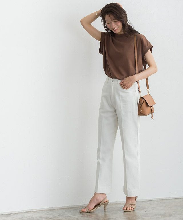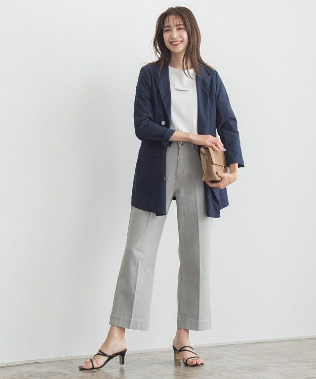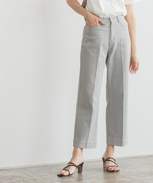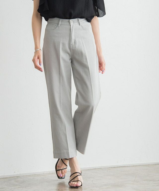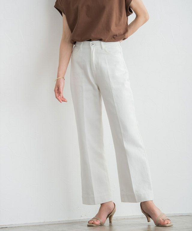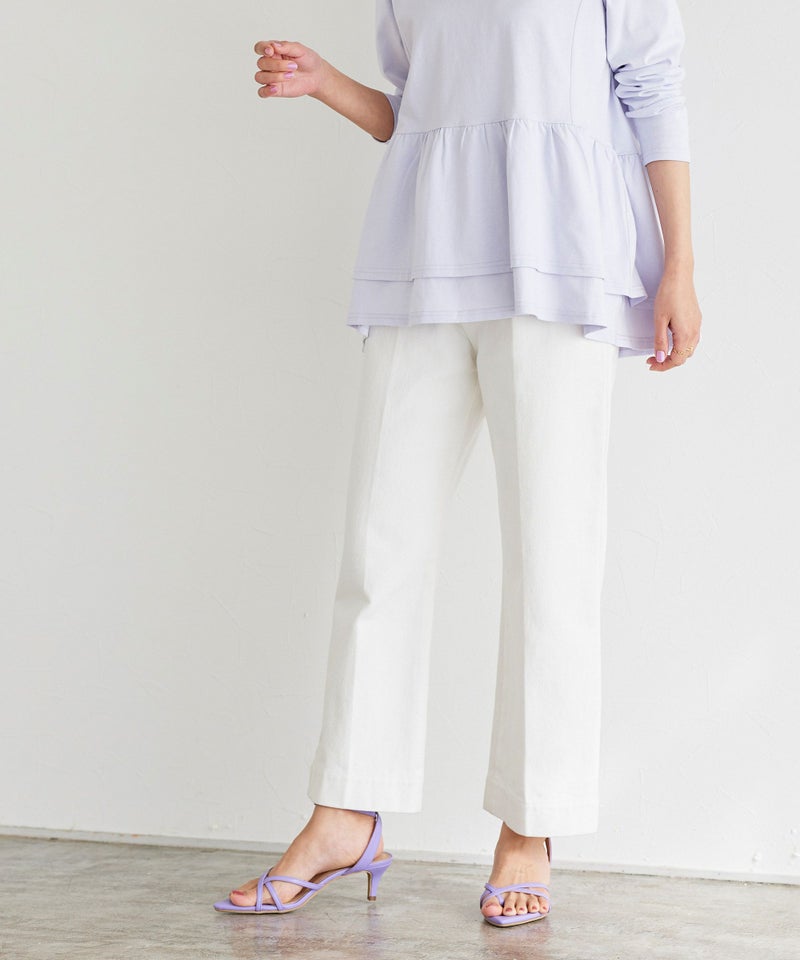 裾に向かったストレートラインがきれいめで、センタープレスが入っているため、カジュアルな素材ながらもすっきりと着用していただけます。