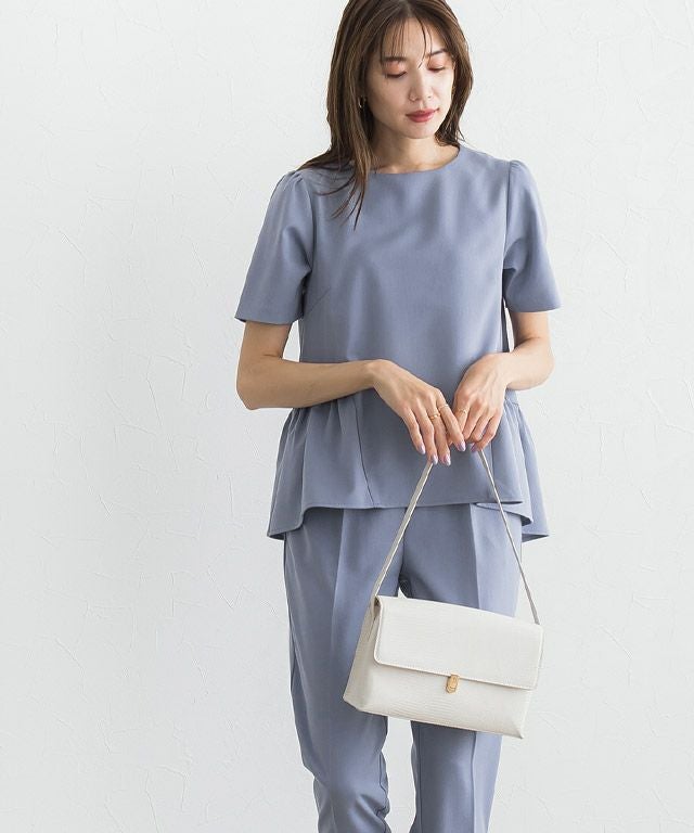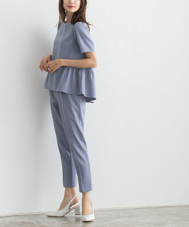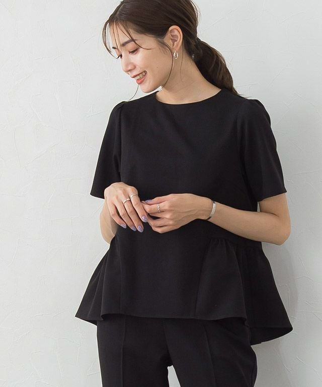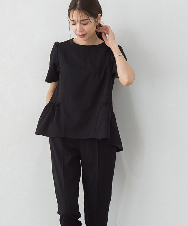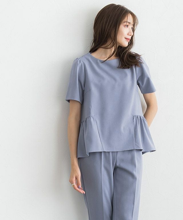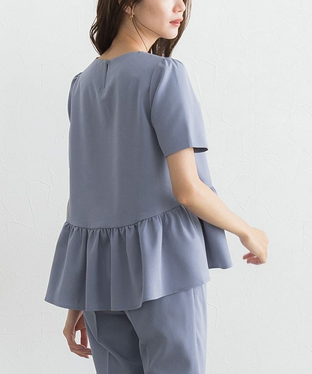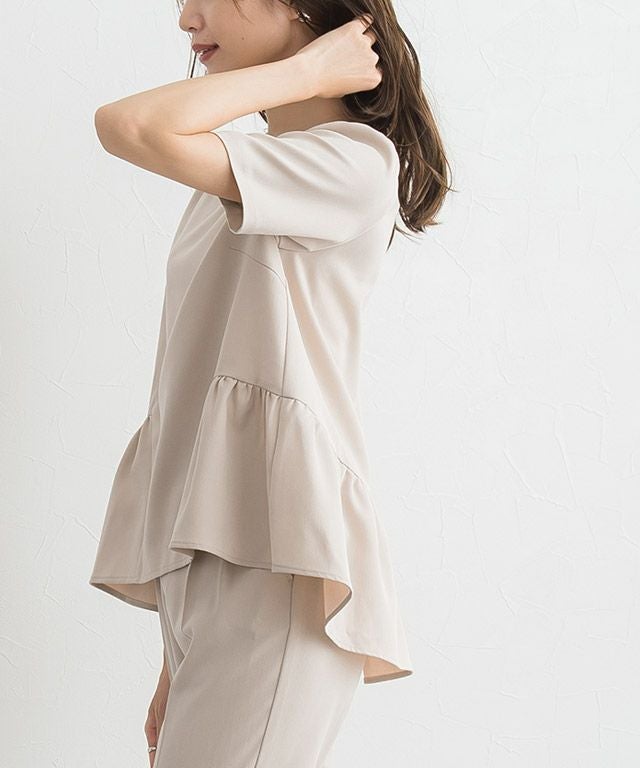 サイドから後ろに広がるフリル切り替えがフェミニンなセットアップ。トップスにデザインがあるのでシンプルなトラウザーパンツとの相性抜群◎セットアップとしての着用はもちろん、単品でもお楽しみいただけます。