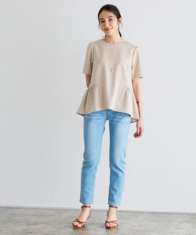 B トップス: 着丈はお尻が半分隠れる丈感でした。袖丈は半袖です。肩回りに少しギャザーが入っているので二の腕を程よくカバーしてくれます。