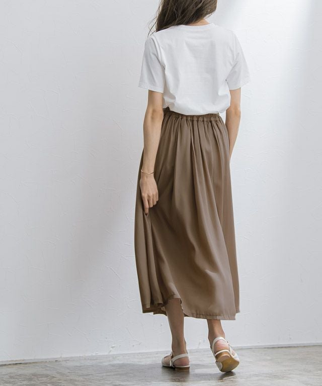 B 着丈はふくらはぎ下の丈感でした。ウエストはゴム仕様で着脱も楽にできます。たっぷりと生地を使っているので、ふんわりと広がるスカートです。