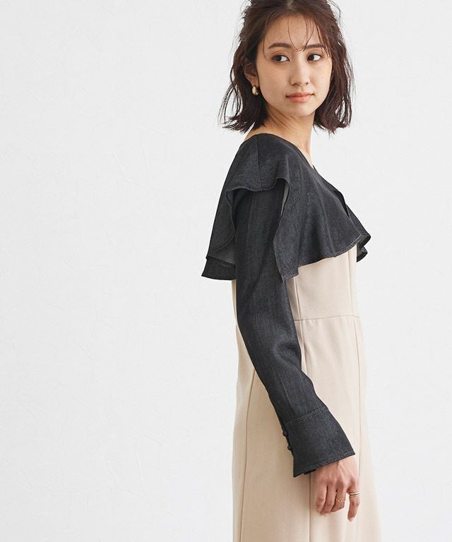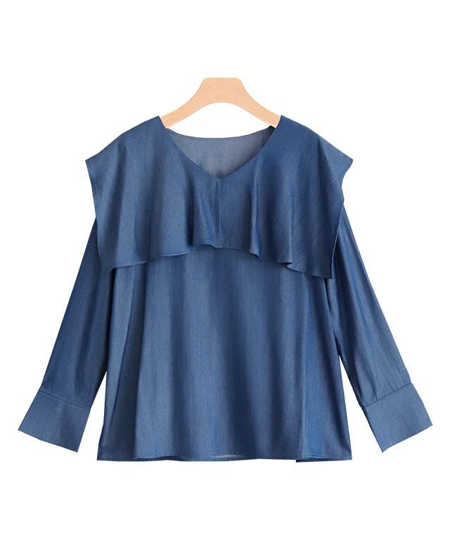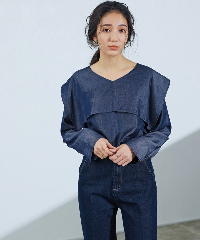 レトロムードなトレンドスタイルに“デニム風ビッグカラーブラウス”
