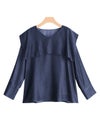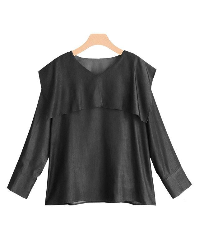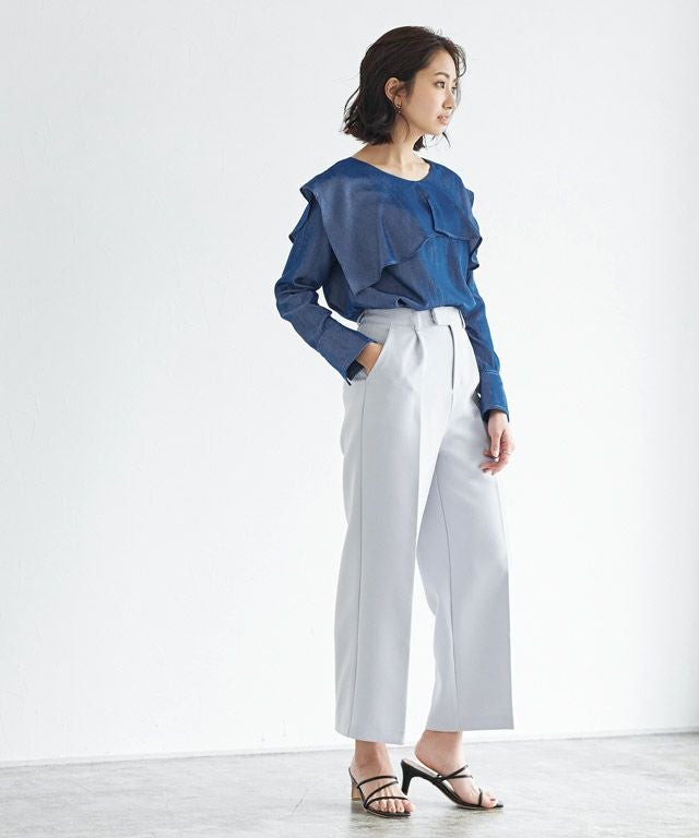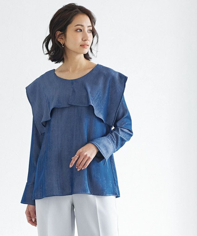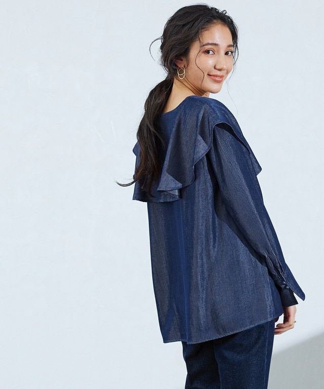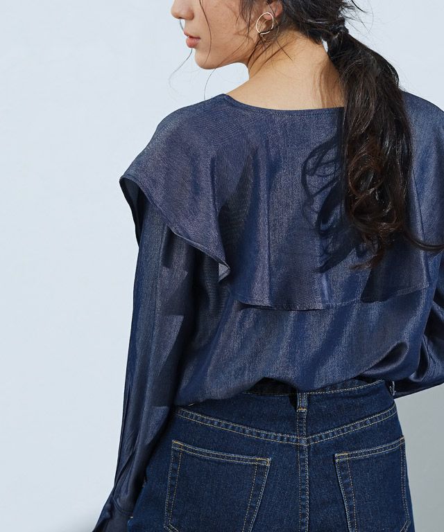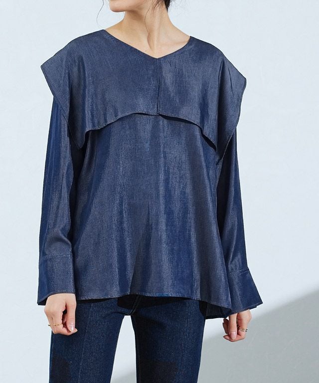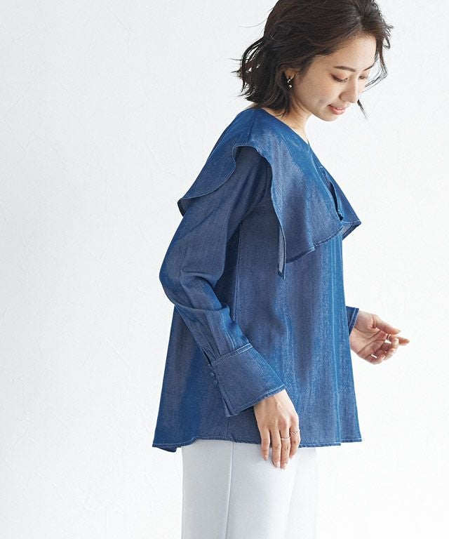 デニム風に染めたサテン素材なので、カジュアルすぎずフェミニンさのあるブラウスに。薄手で落ち感のある風合いが、女性らしい雰囲気へと導きます。