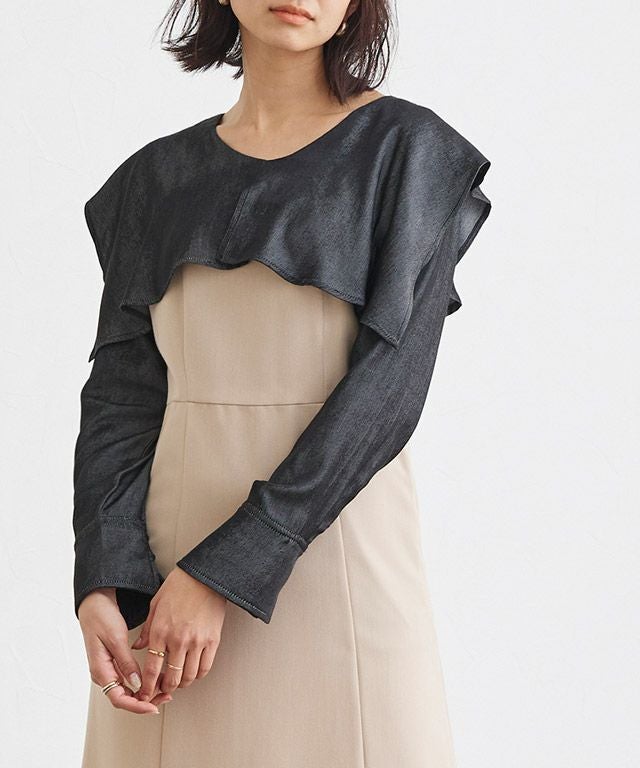 光沢のある生地です。ちょっと肩幅ごつく見えるかもしれません。