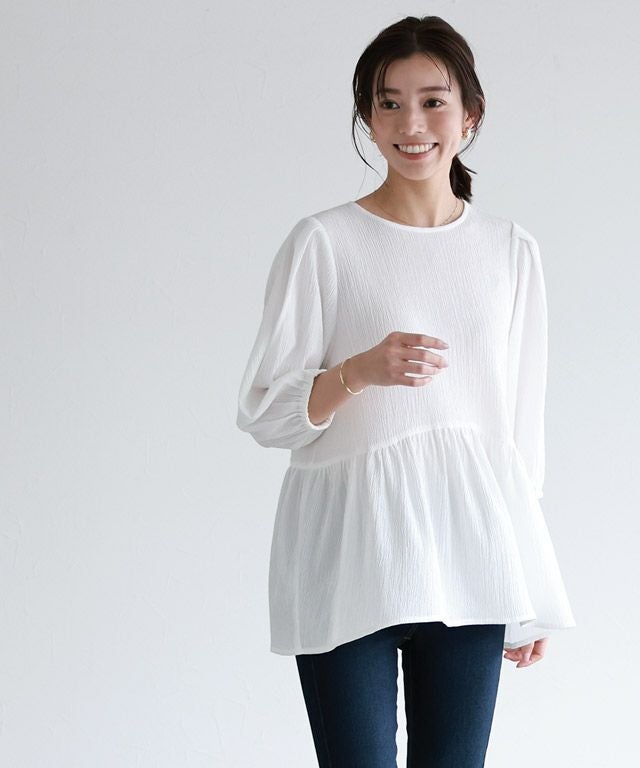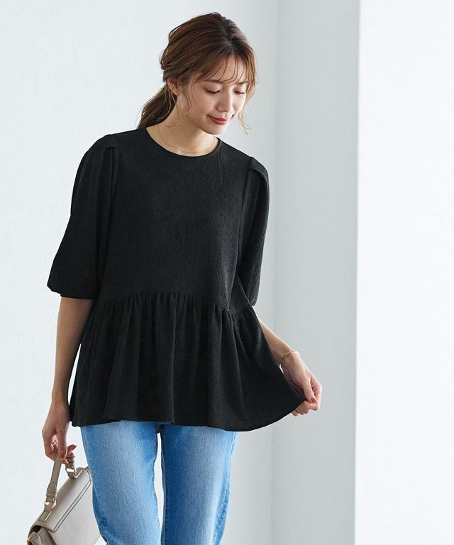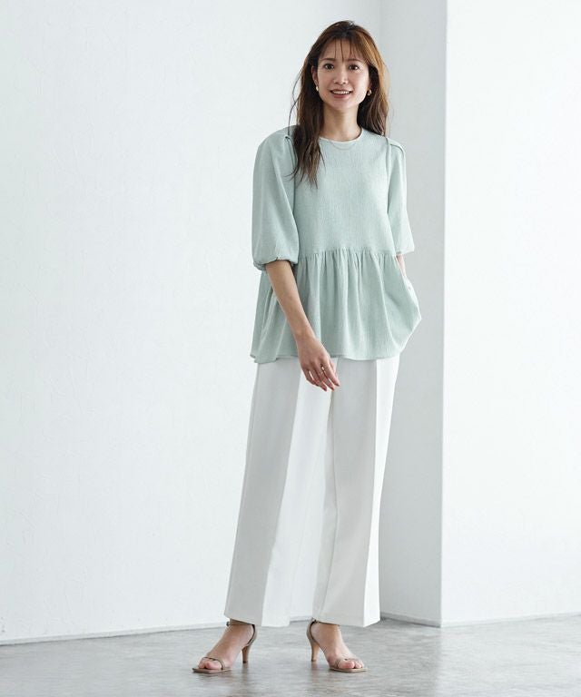ふんわり広がるギャザー切替が華やかな印象に◎体型カバーしつつ、お洒落も楽しめる一枚。ボリュームスリーブがトレンド感と女性らしさを漂わせ、一枚で着映えるブラウスです。