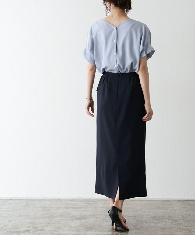 サイドにデザインされたポケットが程よくアクセントに。すっきりとした見た目ですが、ヒップラインを拾い過ぎない絶妙なサイズ感もポイントです。カジュアルになりすぎないように、敢えてミニマルなデザインにこだわりました。