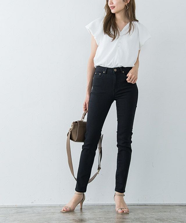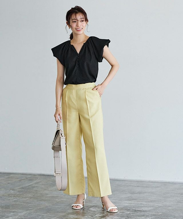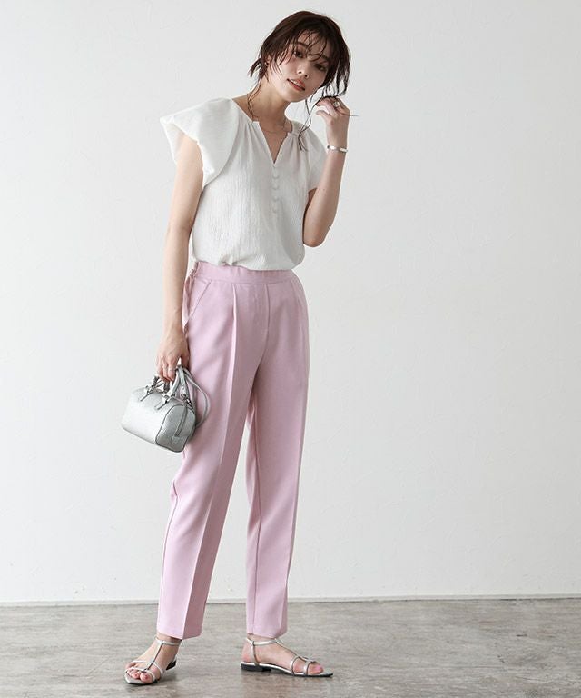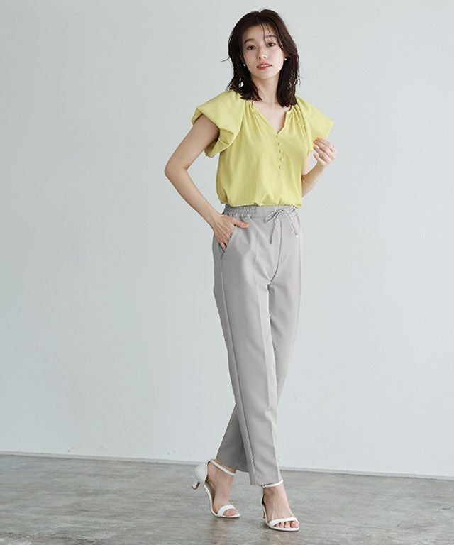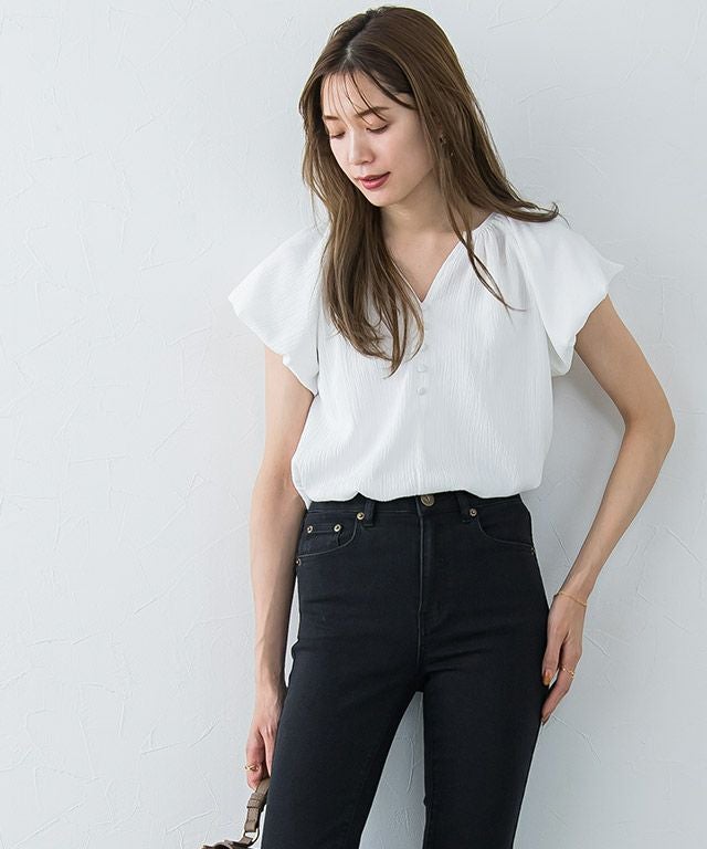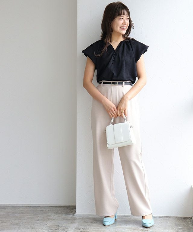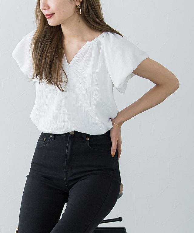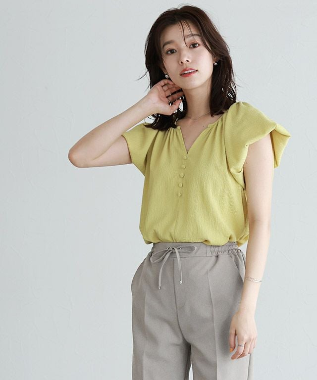 程良く甘さがあって着映える“キーネックパフスリーブブラウス”