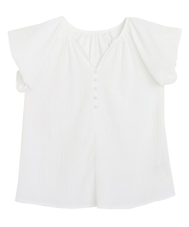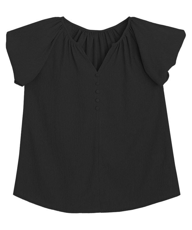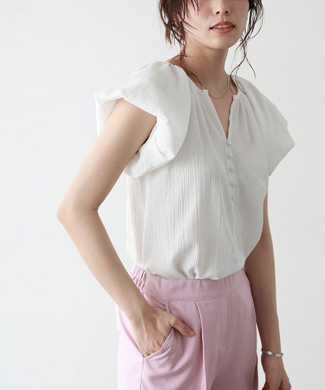 フレンチスリーブのバルーンが肩回りをカバーしつつ、女性らしい雰囲気に仕上げてくれるデザインブラウス。首元はキーネックで抜け感をプラスしました。フェミニンなデザインですが、カジュアルボトムとの相性も◎きれいめにもカジュアルにも着回せる一枚です。