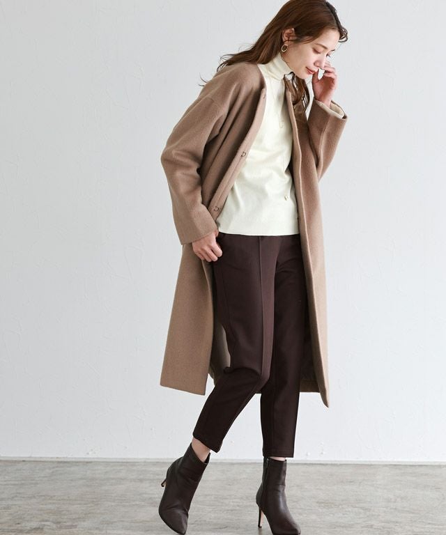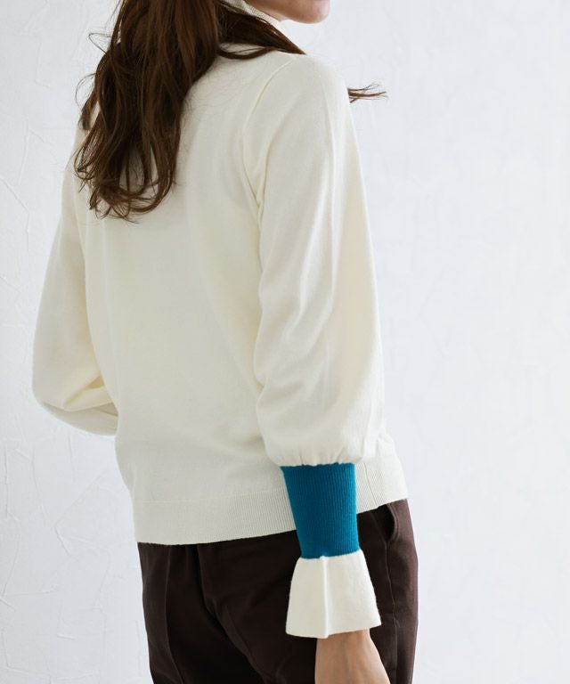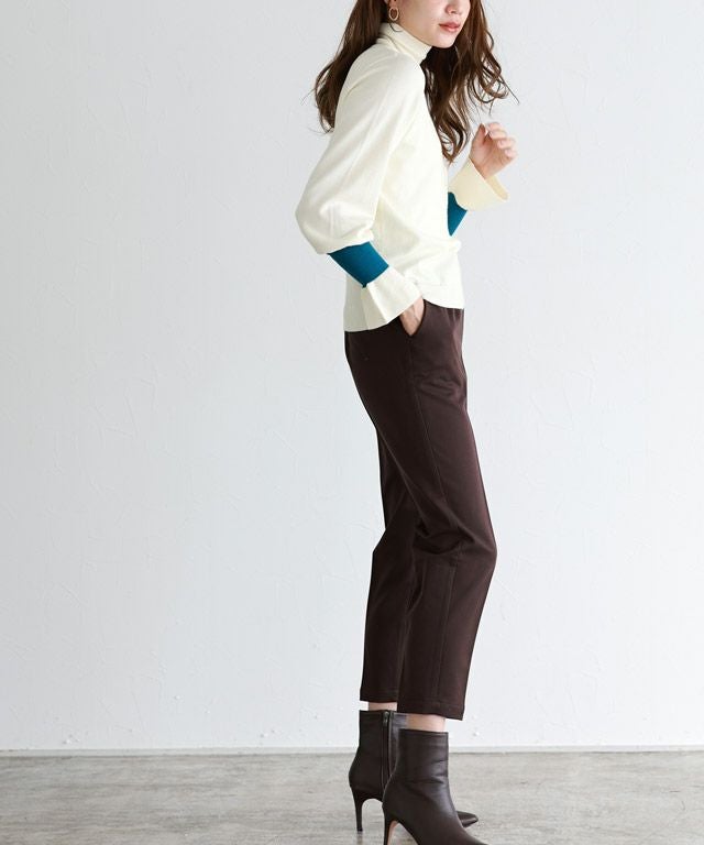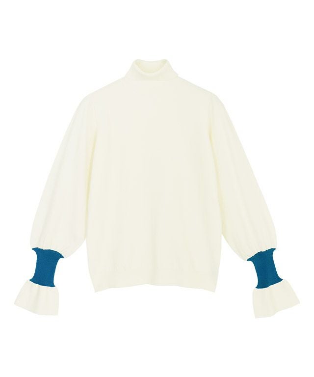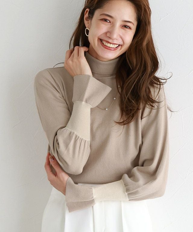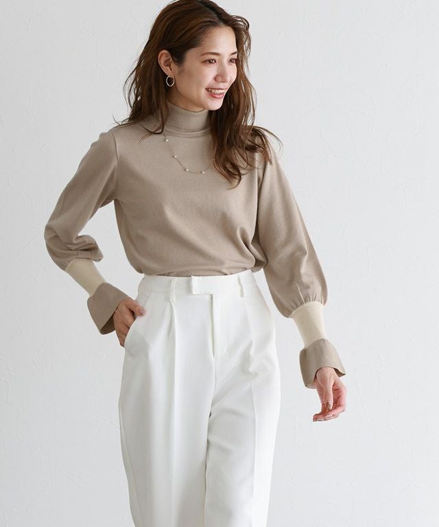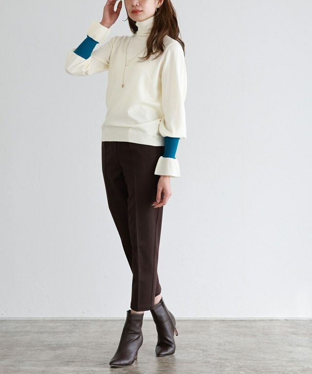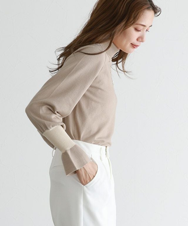 身頃はシンプルなデザインなので、様々なスタイリングに着回しやすい一枚。長めのハイネックデザインと、袖リブのアクセントカラー&袖口にフレアをあしらうことで、スタイリングをこなれ感のある印象に導きます。